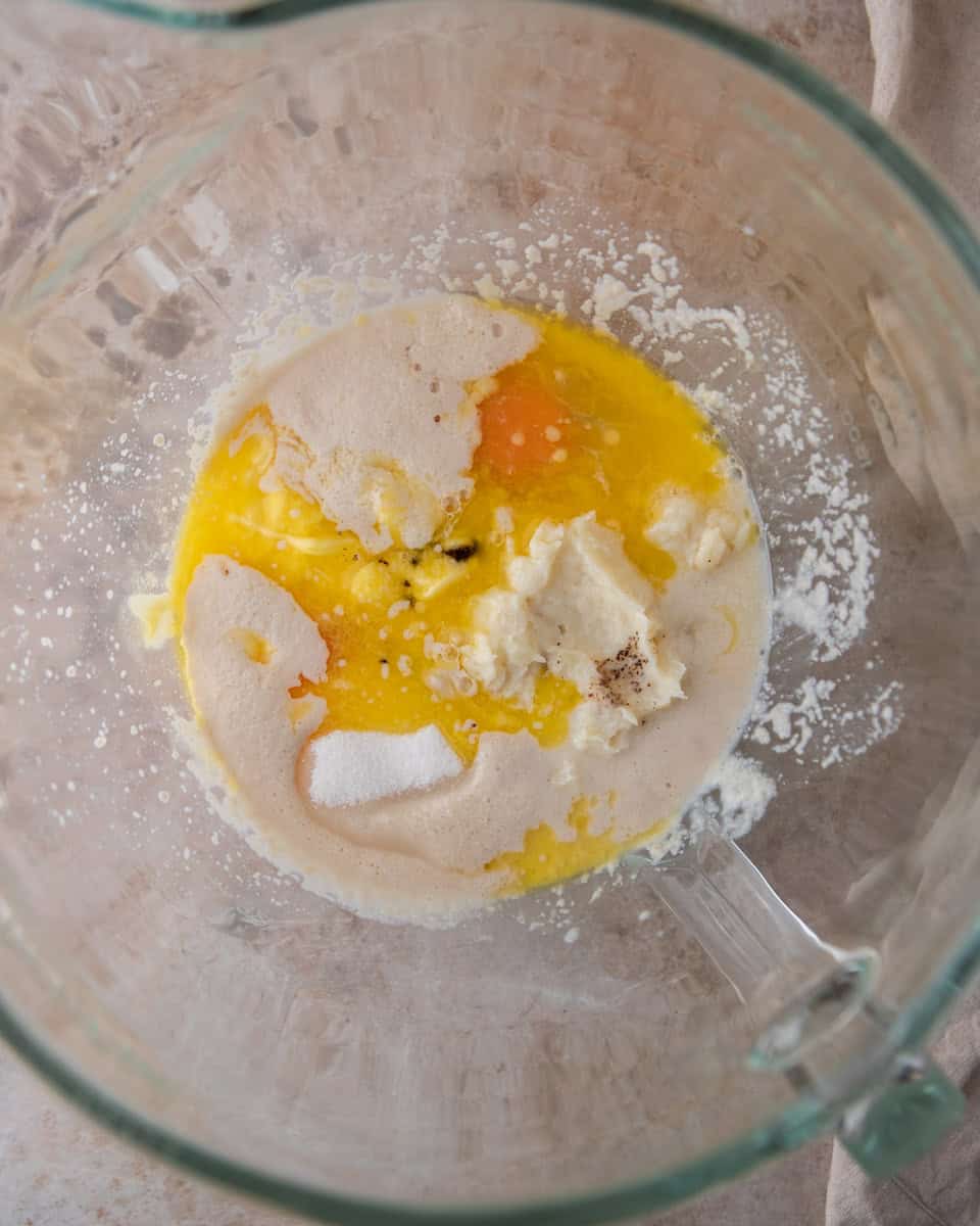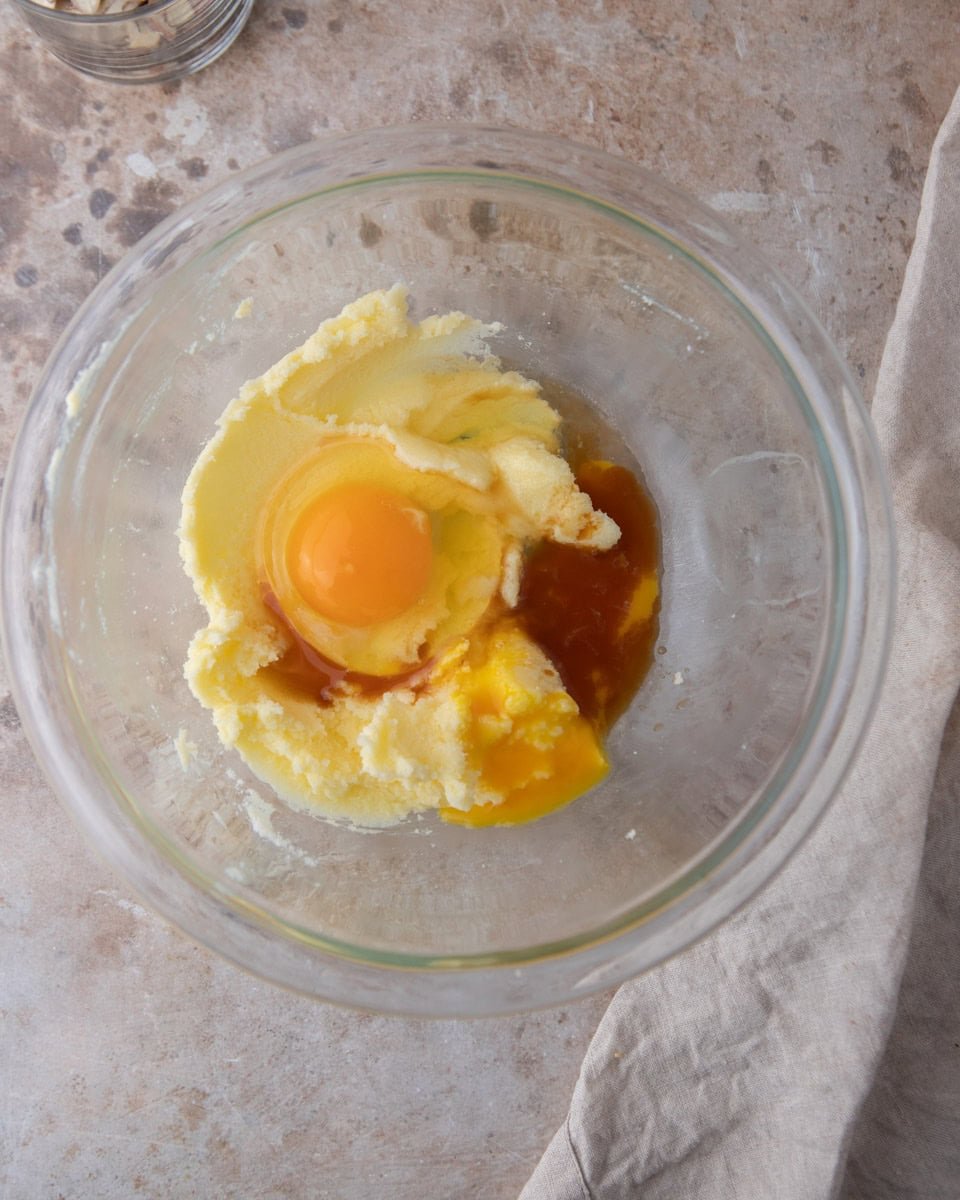 • Add almond flour, flour, an egg, egg yolk, almond extract, vanilla extract, and salt. Mix until smooth and creamy.