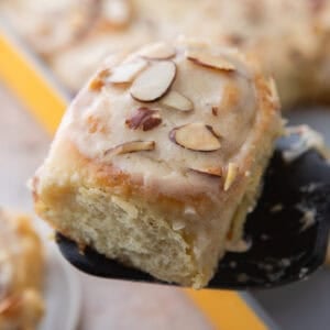 A buttery almond glaze poured over warm rolls creates that signature bakery finish. Toasted sliced almonds add crunch and contrast in every bite.