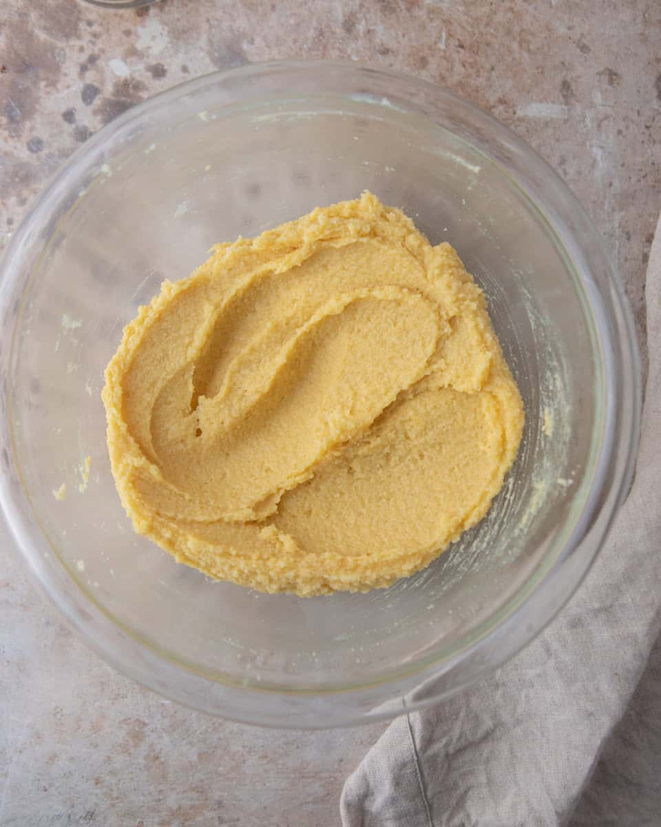 • In a medium bowl, beat together softened butter and sugar until light and fluffy (2-3 minutes).