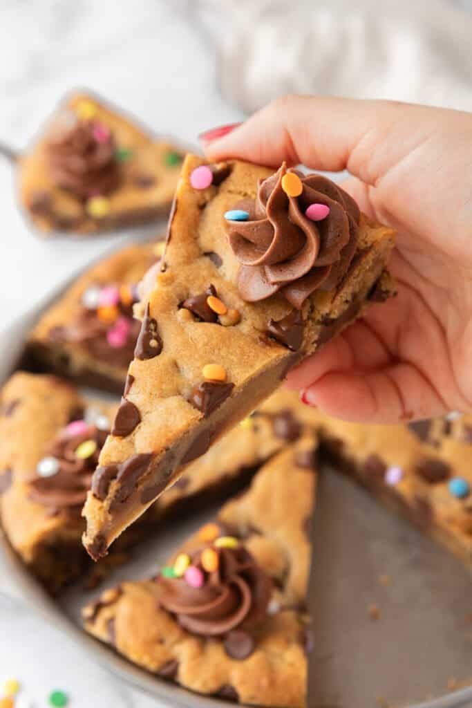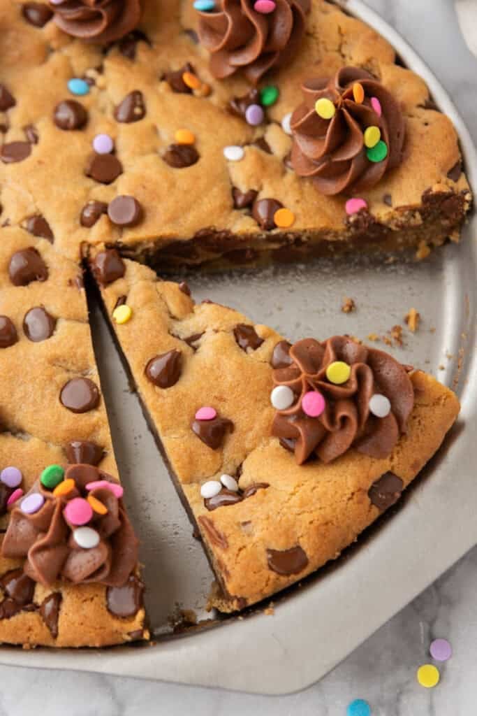 - Top with more chocolate chips while it’s still warm if you’d like, or once cooled, decorate with chocolate or vanilla frosting using a piping bag and colorful sprinkles for an extra festive touch.