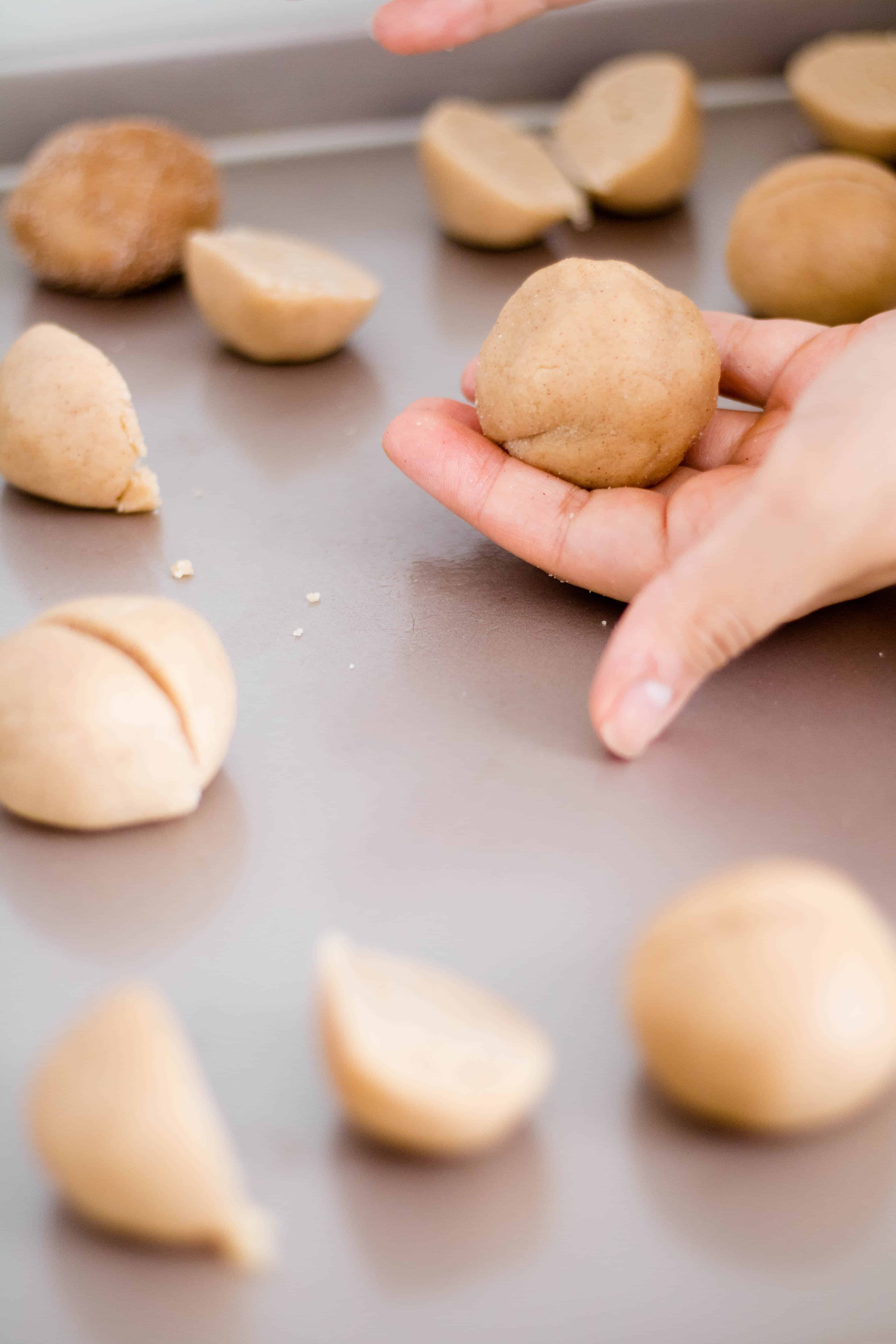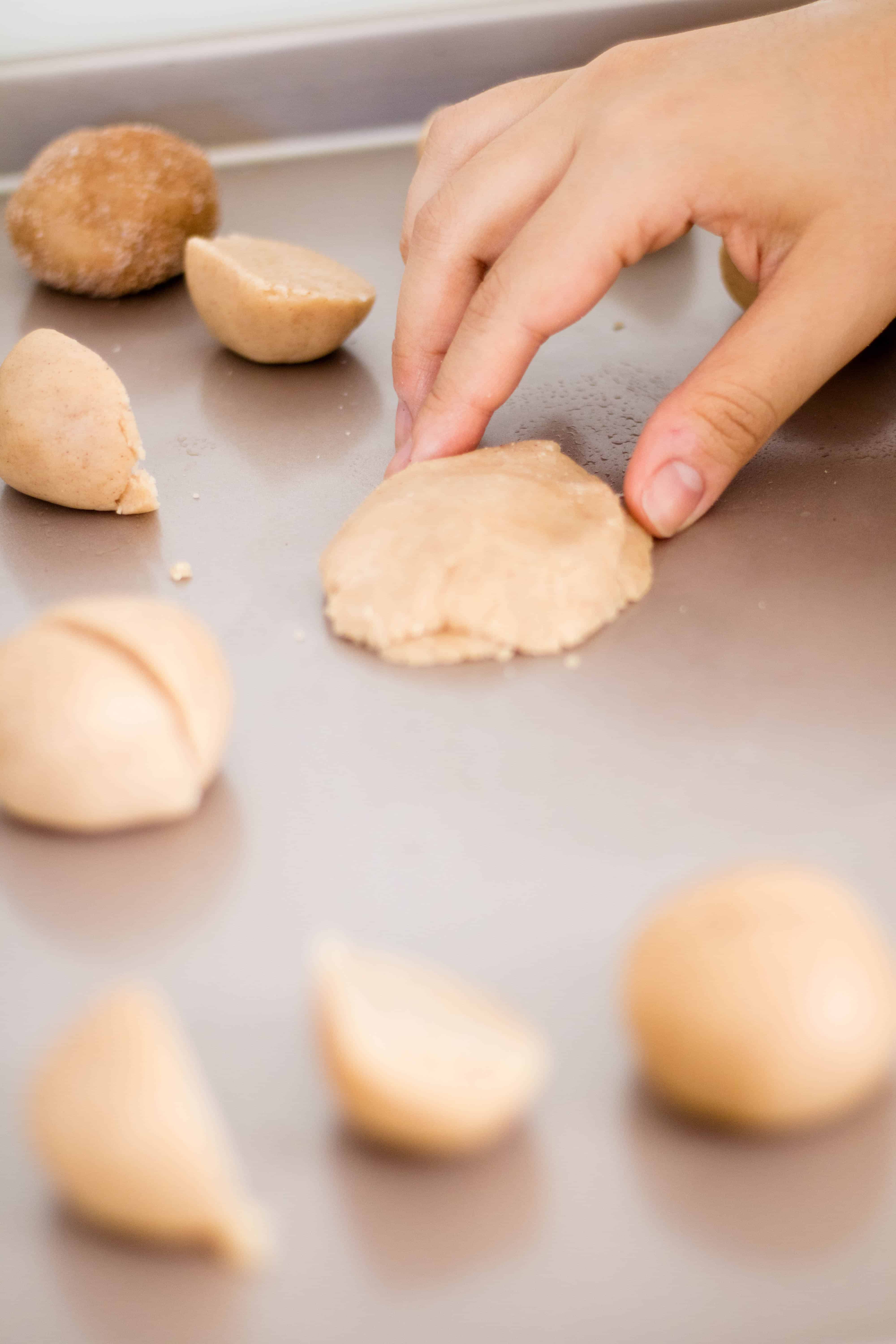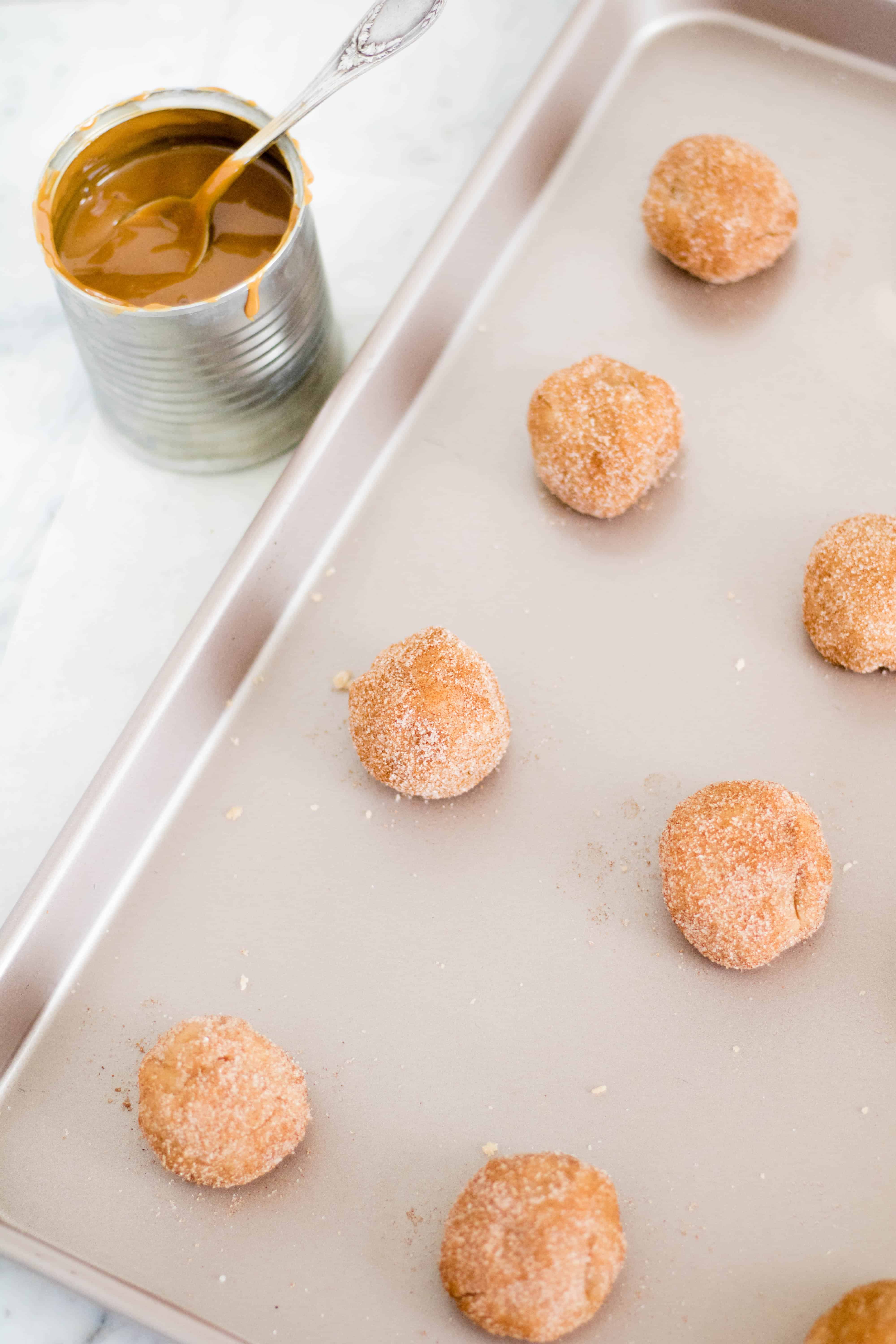 Just like any other snickerdoodle recipe, You mix the dough, roll it into balls, and roll it in cinnamon-sugar before baking. The only difference is that we are going to split each cookie dough ball into 2, this way we can stuff it with our luscious dulce de leche filling then seal it back.