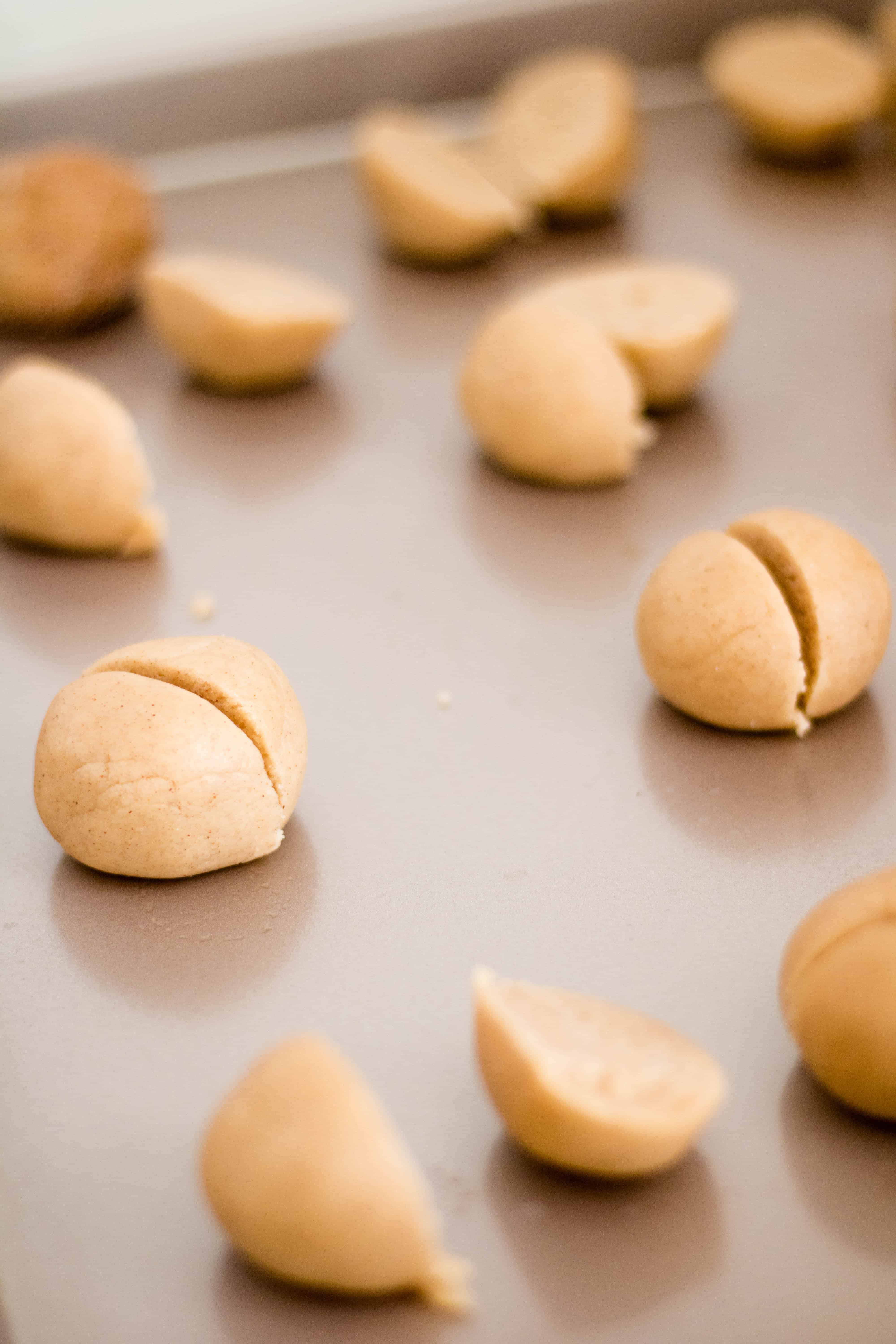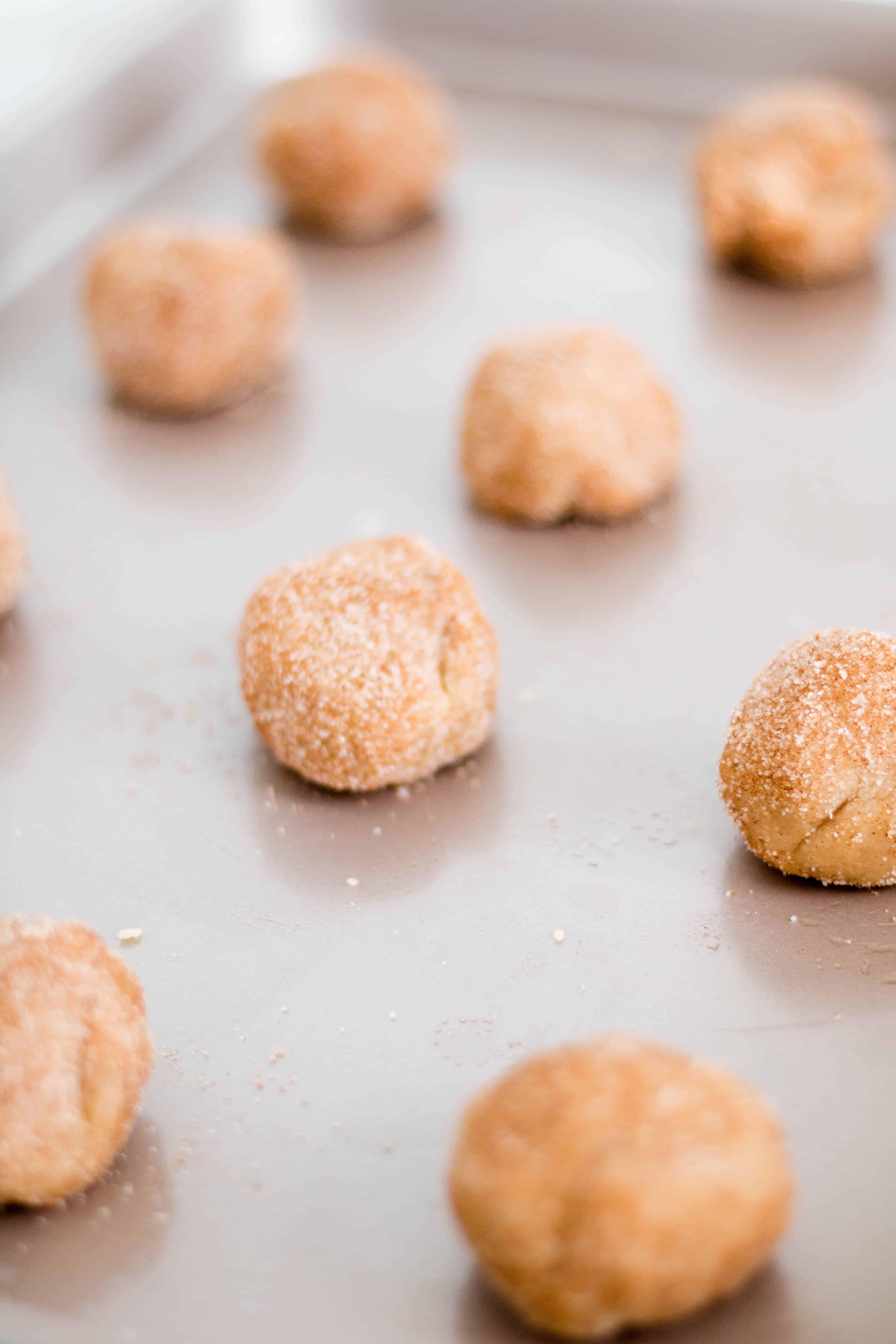 - Roll each cookie dough ball in the cinnamon-sugar mixture and place on your non-stick cookie sheet. Leave about 2 inches between each cookie.