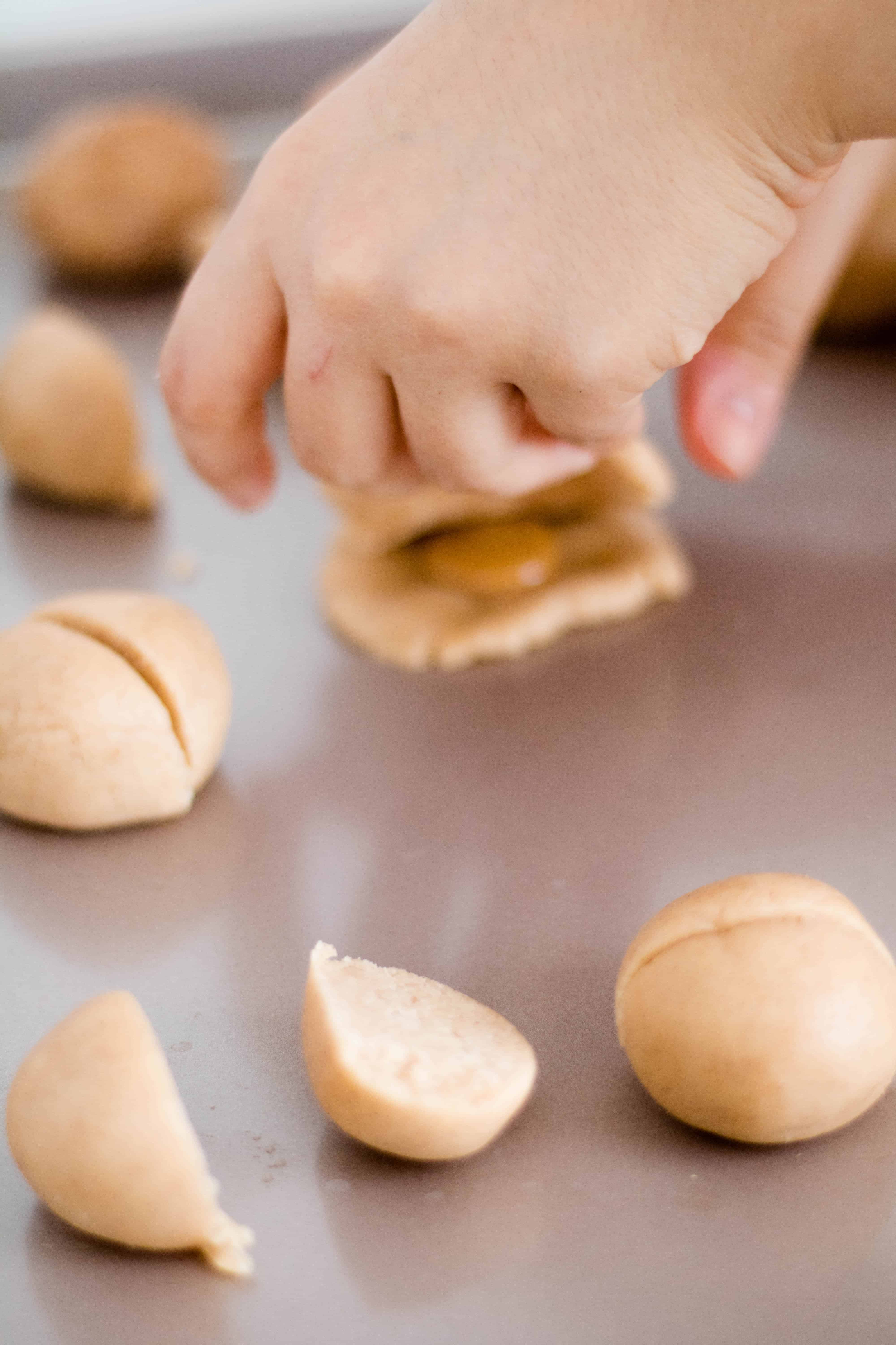 - Flatten the first half add about 1-2 teaspoons of dulce de leche in the center and cover with the flattened second half.
