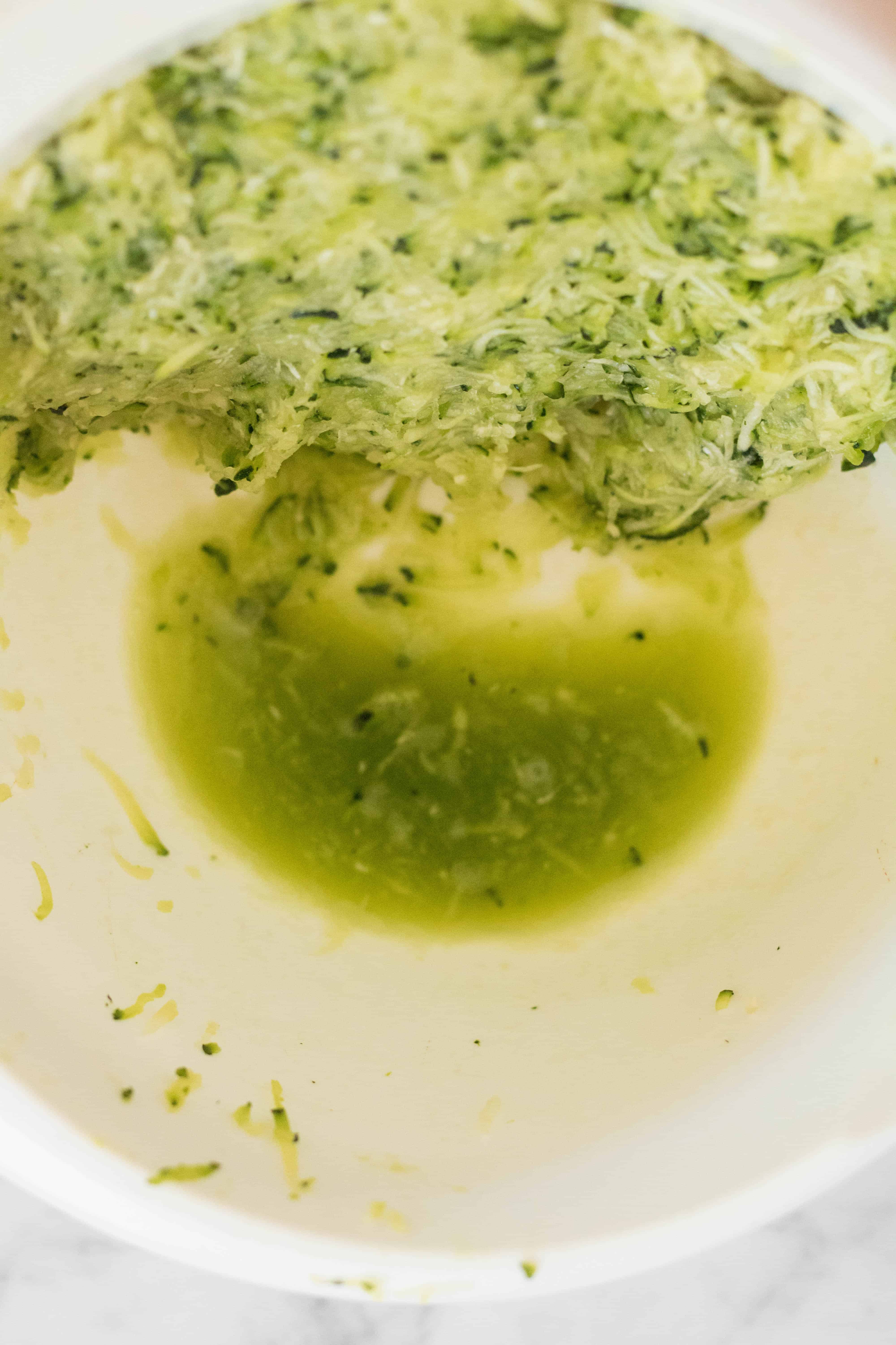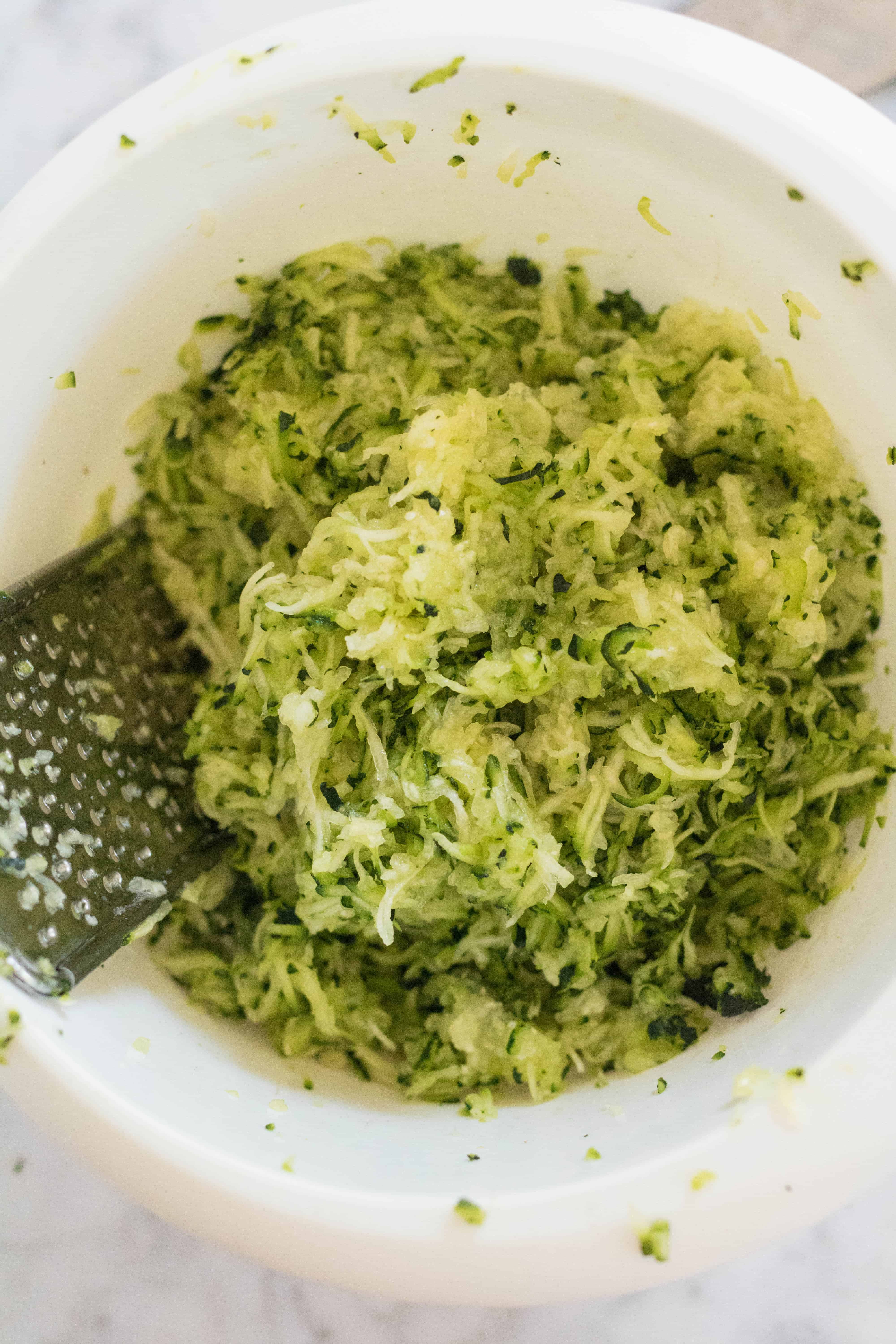 First start by grating your zucchini, then drain all that excess water using a strainer or a cheesecloth!