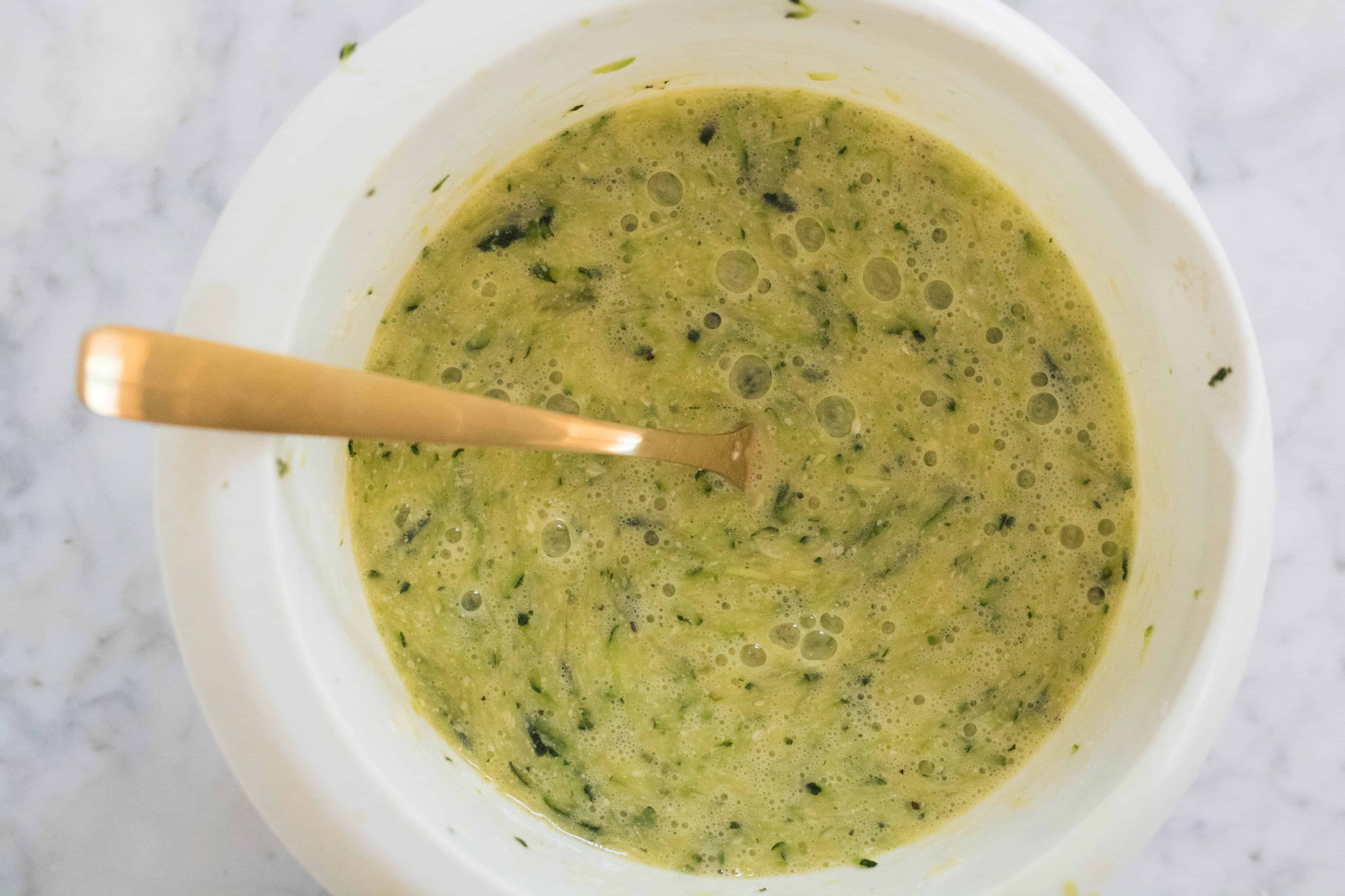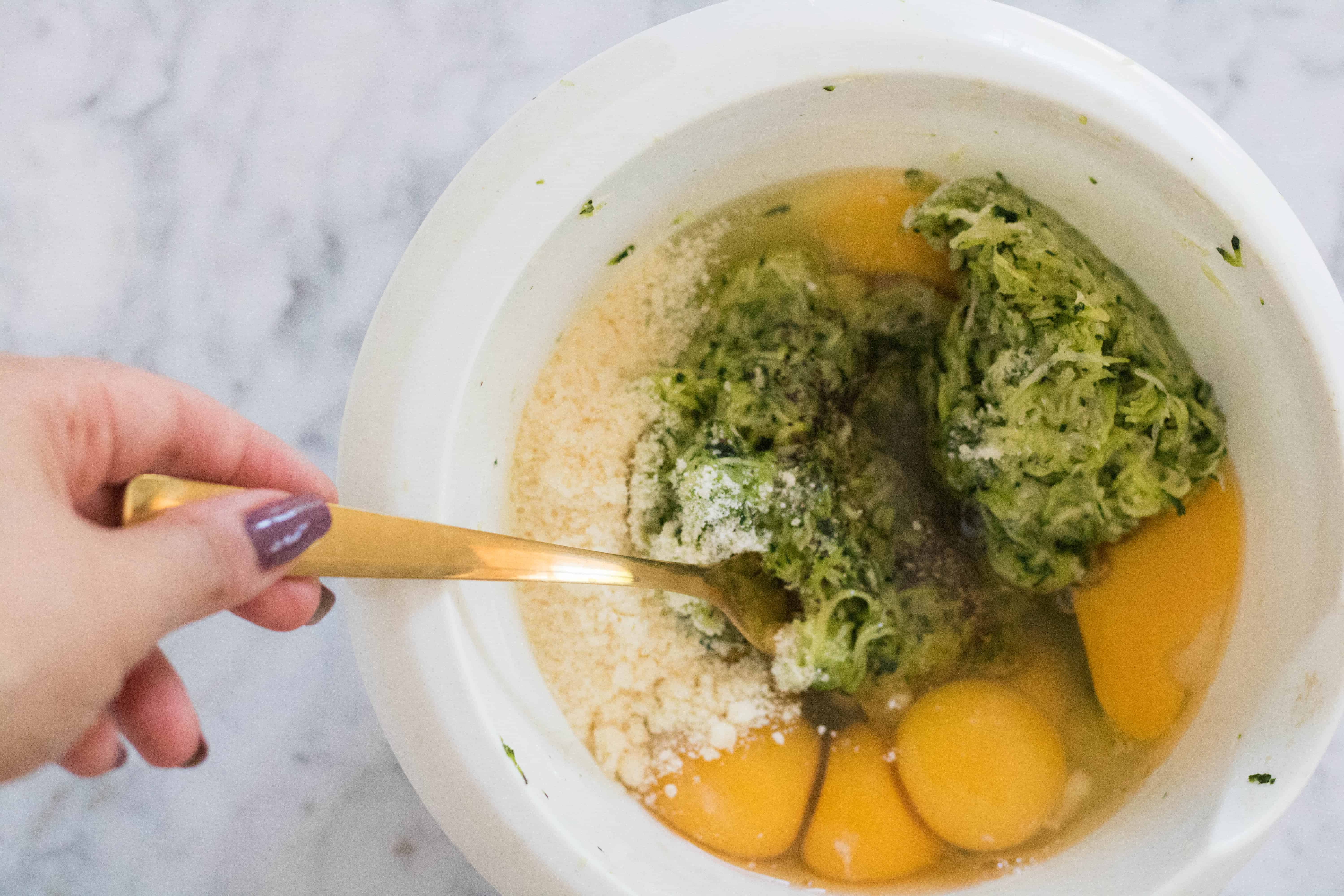 - Grate the zucchini and squeeze out the water from it using a strainer or a cheesecloth. add in the parmesan cheese, the salt, pepper and combine. Add the eggs and whisk vigorously until well blended.